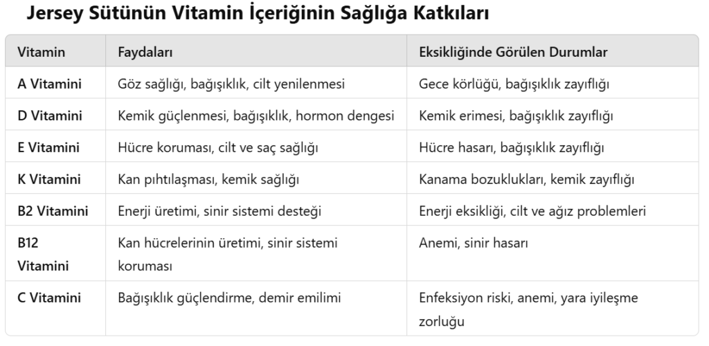 - Özellikleri: Jersey sütü, K vitamini içerir; bu vitamin kan pıhtılaşması için gereklidir.